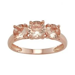 Adorned with three round-cut simulated morganite gemstones this 10 rose gold ring is altogether captivating.