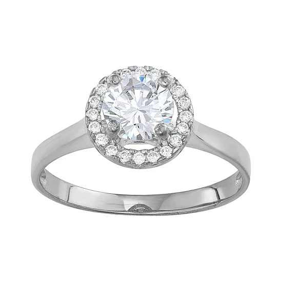 You’re sure to draw attention whenever you don this dazzling 10k white gold cubic zirconia halo ring.