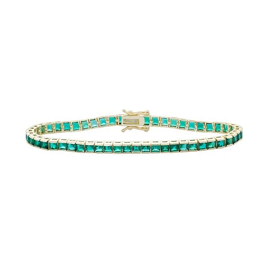 Lined with princess-cut, lab-created emerald stones, this 14k gold over sterling silver tennis bracelet gives your outfit a radiant look.