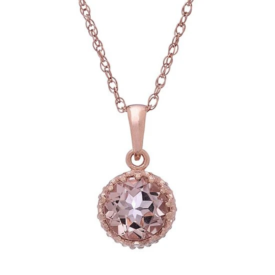 A round-cut simulated morganite stone in a crown-like setting makes this 14k rose gold-over-sterling silver pendant a piece fit for royalty.