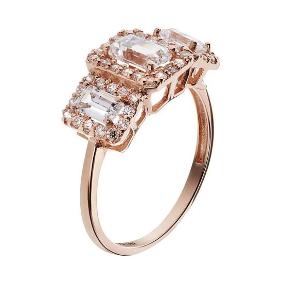 Achieve dazzling beauty when you wear this cubic zirconia ring. Emerald-cut stones framed by round-cut stones create a stunning tiered halo design.