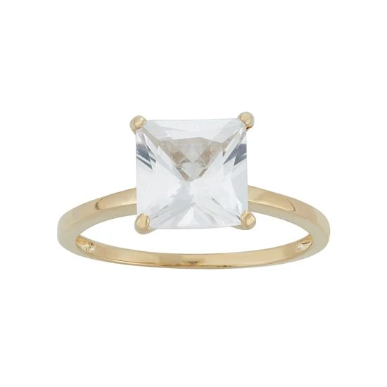 A princess-cut, lab-created white sapphire stone gives this 10k gold ring dazzling beauty.