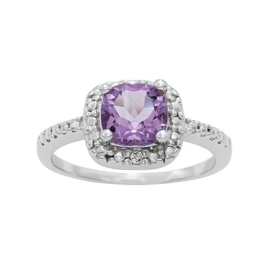 A cushion-cut amethyst center stone illuminates this sterling silver square halo ring.