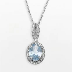 Adorned with lab-created aquamarine and lab-created white sapphire stones, this sterling silver oval halo pendant is absolutely dazzling.