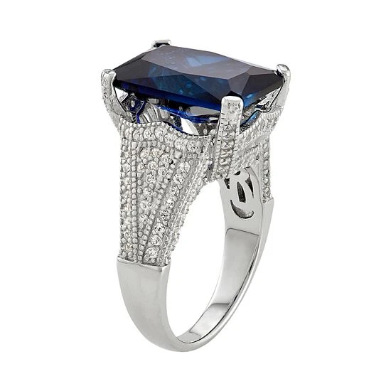 Featuring a bold, lab-created blue sapphire center stone, and decorated with milgrain and lab-created white sapphire accents, this sterling silver ring makes an eye-catching addition to your look.