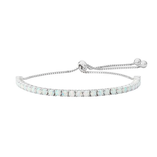 Adorned with lab-created white opal stones, this adjustable lariat bracelet abounds with elegant beauty.