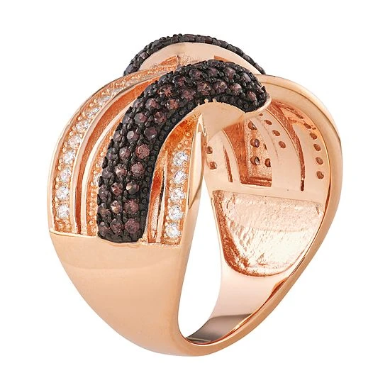 Decorated with white and mocha-colored cubic zirconia stones in an elegant woven design, this unique ring offers a distinctive look you’ll love.